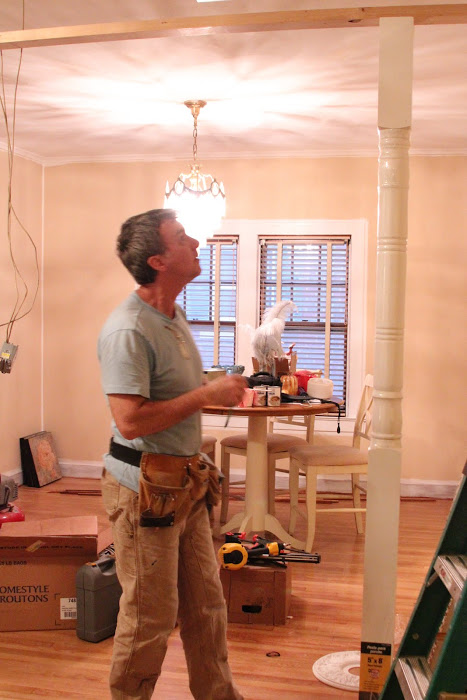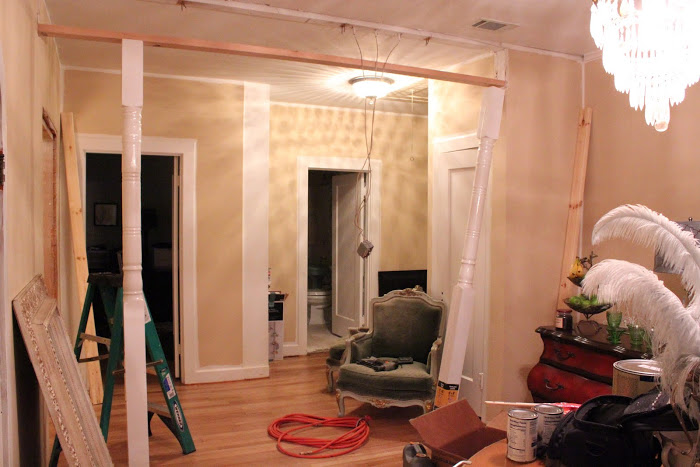 When we bought the house, we tore out a wall between the dining room and the hallway, opening the space up quite a bit. This was actually our friend, Joseph’s idea (thanks, Joseph!). The wall originally just had a door connecting the areas. About three weeks ago, we bought some posts to decorate the space where the wall was, and Randy is going to build an arch connecting the posts to match the other archways in the house. We’ve not gotten too far with it yet, but thought I’d share anyway.