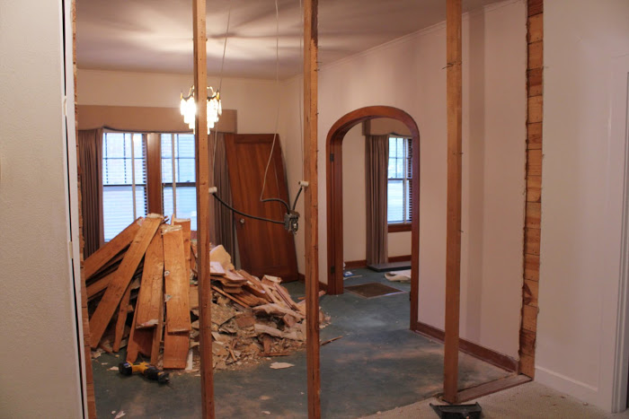 I’m mad at myself because of all the pictures I took before we started this whole project, I didn’t get one facing the wall we knocked out. But you can see it here in this picture. This is taken from the living room. You can see half the dining room and that wall to the right. If you’ve looked at previous posts, you can see here that we also blocked a doorway in the living room leading to the front bedroom, and took the door out and widened the doorway leading into the hallway. I haven’t looked at these “before” pics in a while and I’m in shock at how different it all looks (and it’s not done yet)!