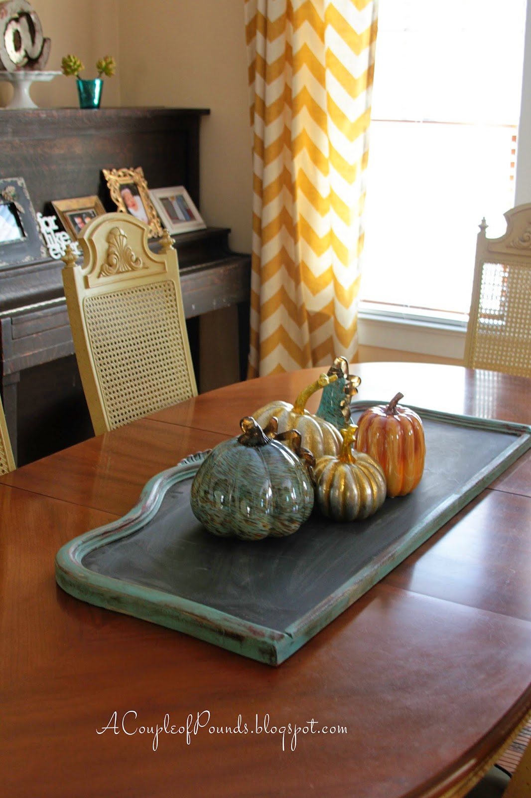 I normally have a chalkboard on the piano. I took it down to write something “fall-ish” on it and when I laid it down on the table, I had this idea….It’s now my table runner.
