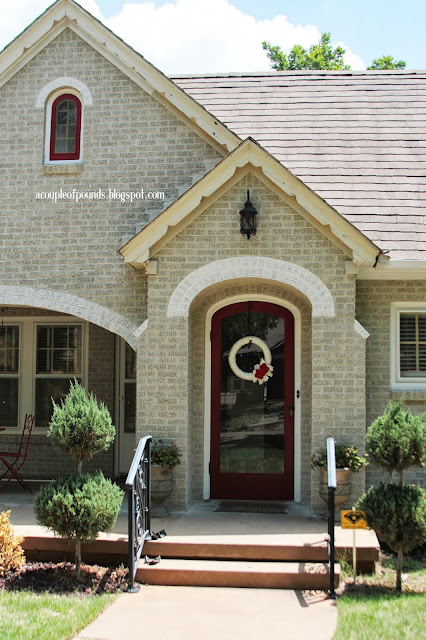 Pictures really don’t do this justice! We have had SO many compliments from our neighbors and friends. (It was a little bright out when I took these pictures, but you gotta do it while the babies are napping!) The house is not completely finished….the trim has to be finished and then we’ll decide if the painted arches around the door, etc., need to go all the way to the concrete (painting an accent on the arches and the fireplace was Hubby’s idea. I really like it). What do you think? Like they are or painted to the ground?