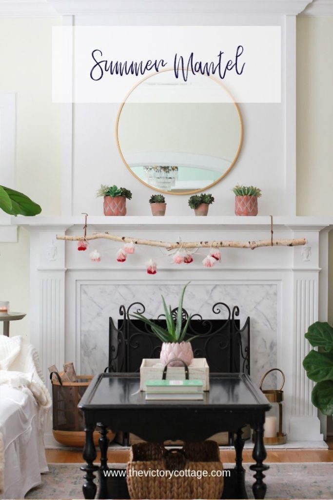 I bought several faux succulents last year and I’ve found I really love them (real ones, too). There were several I had on my dining table last year, and I decided to use them on the mantel this summer. If you saw my mantel two Christmases ago, and also last summer before the makeover, then you know I had hung a birch log under the mantel for decor. I took it down for awhile when we made over the fireplace, but decided to put it back up recently. I strung the tassel garland I used for Valentines’ decor over the birch log and that’s about it! I’m loving the simplicity of it.